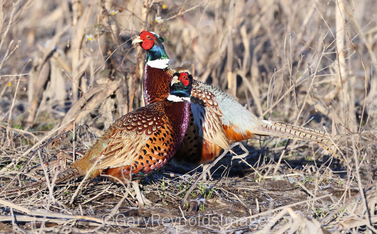 Ring-necked pheasants, often spotted in a corn field just outside Edison, WA.