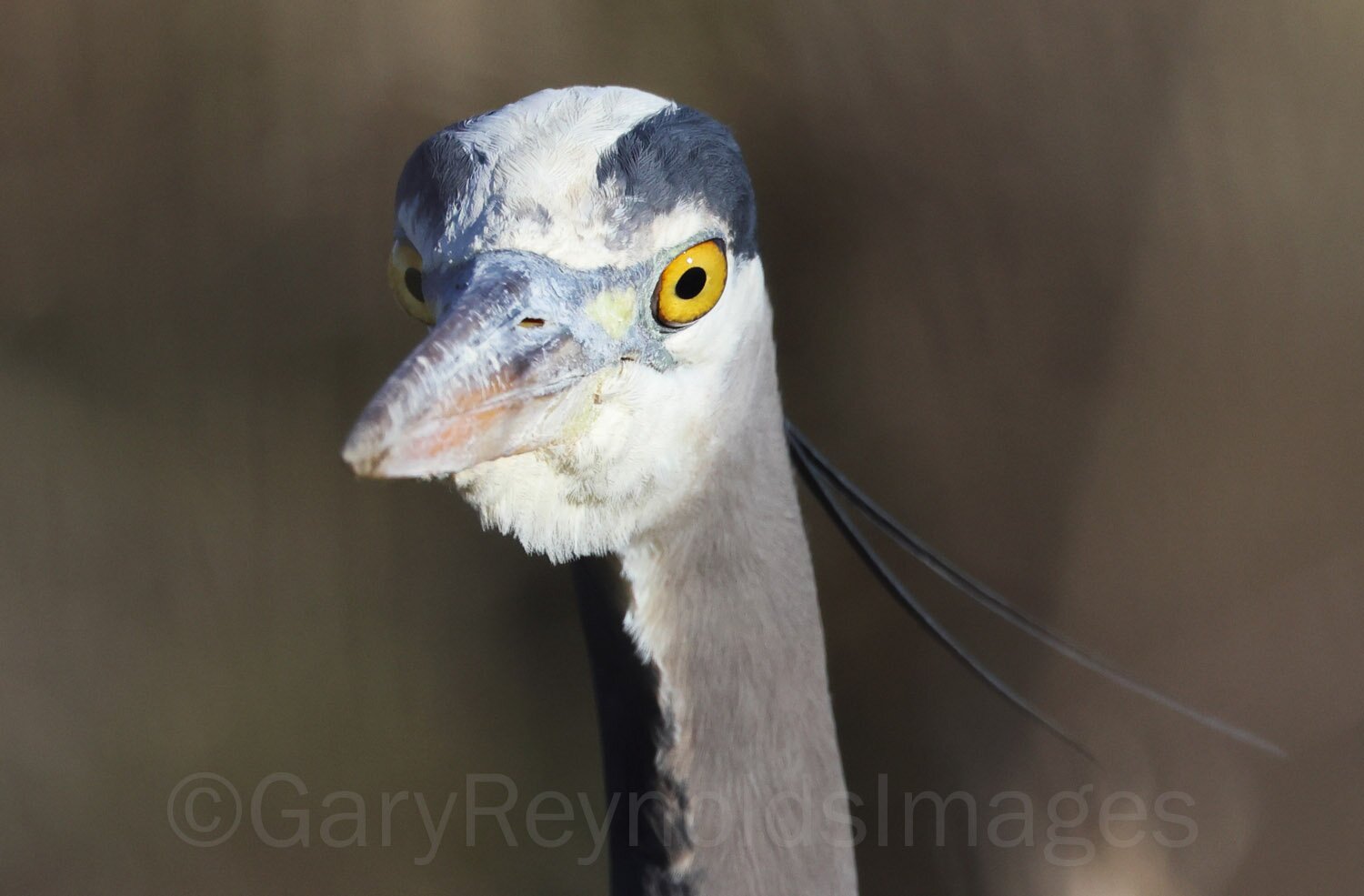 Great Blue Heron portrait from a strange angle.