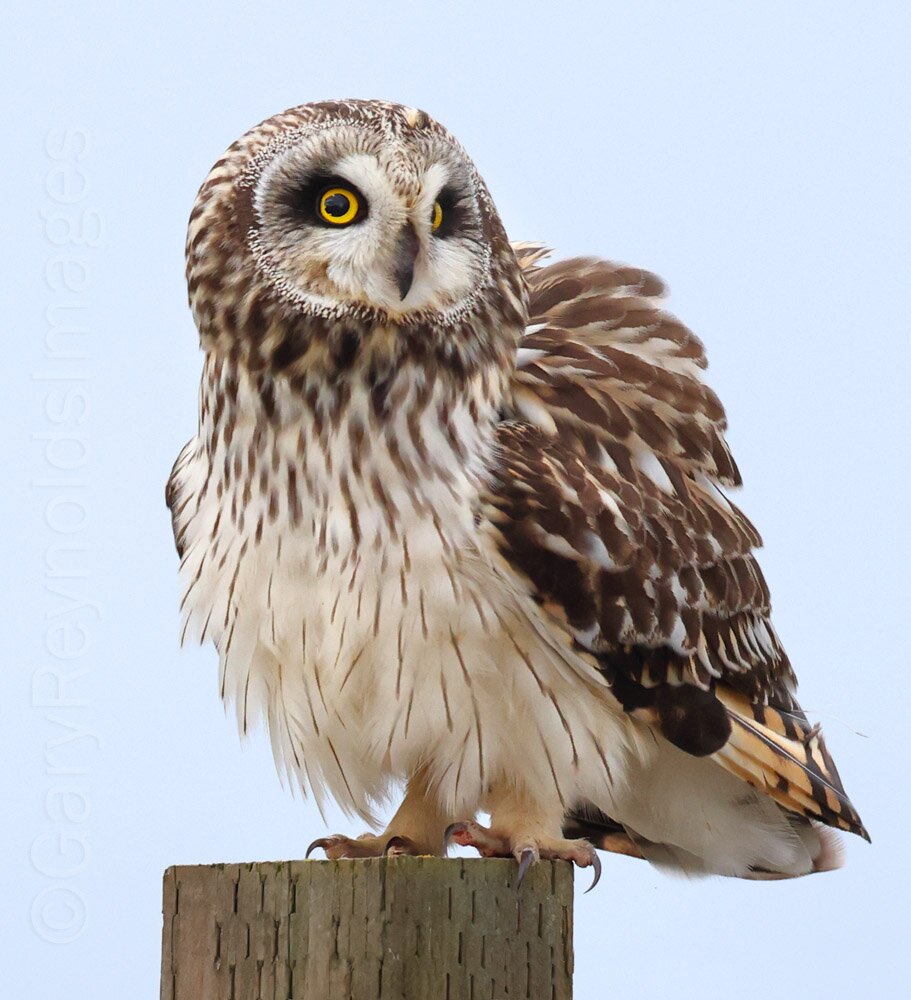 Short-eared owl, landed and fluffed not more than 15 yards away...