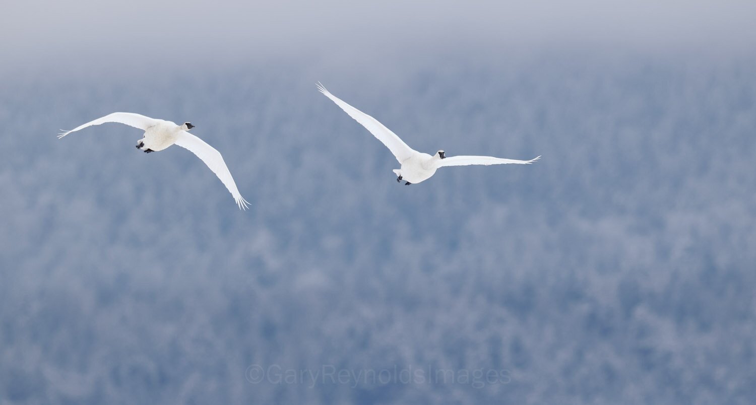 A pair of tundra swans against the snow frosted hills on a February morning.