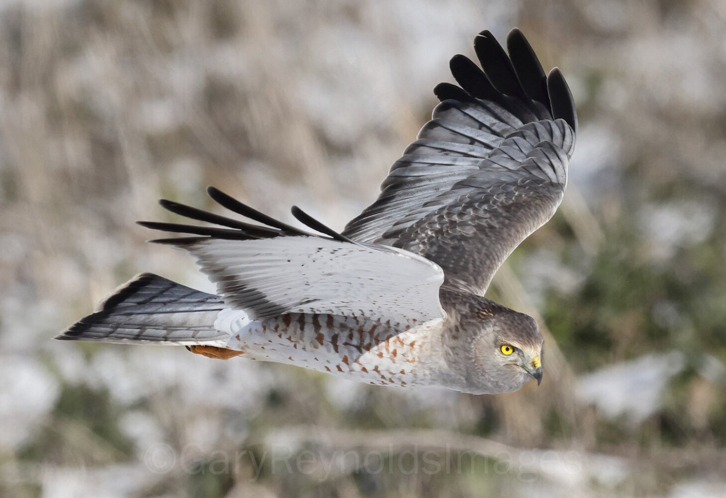 Northern Harrier (male) on a snowy morning.