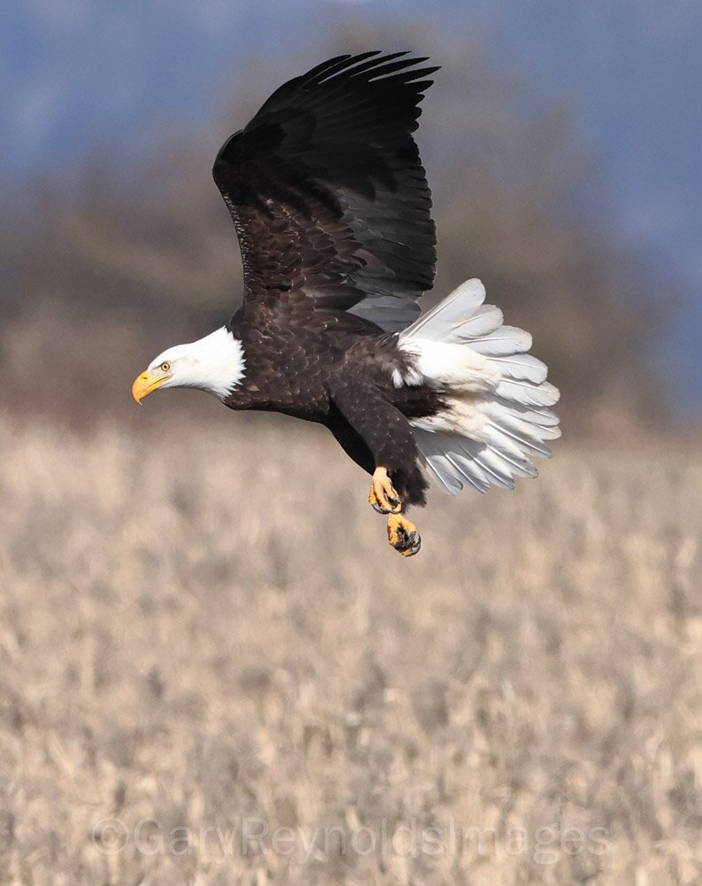 Bald eagle dropping down to a freshly dumped livestock carcass...