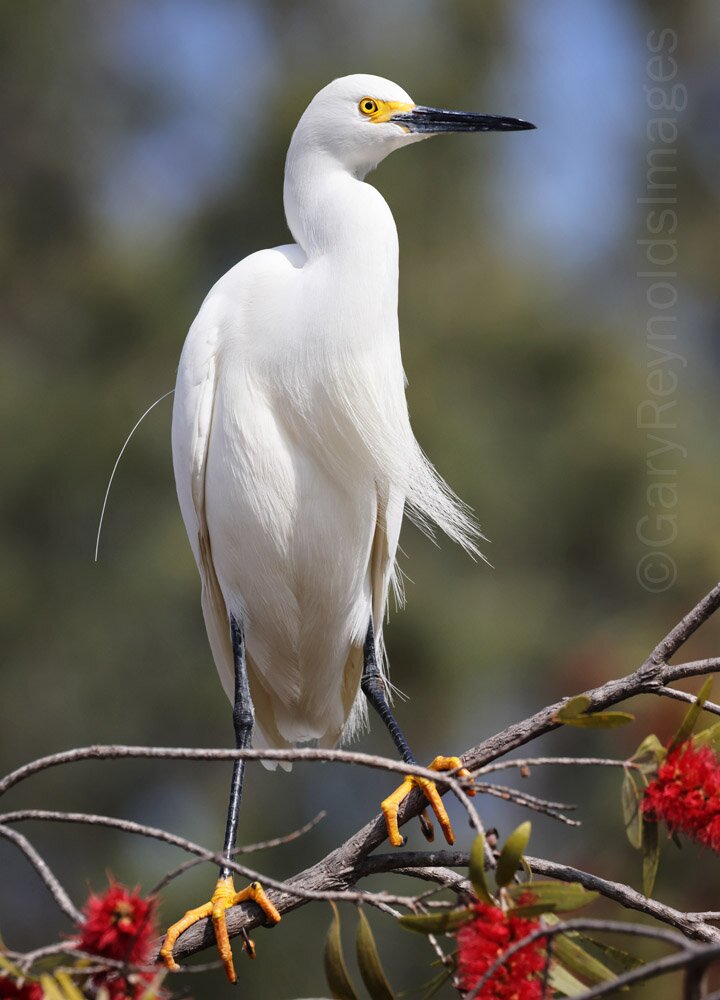 Snowy Egret in a Bottle Brush tree. San Diego, CA