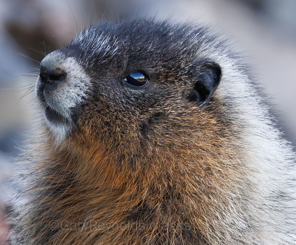Hoary marmot pup portrait with Mt. Baker eye reflection.