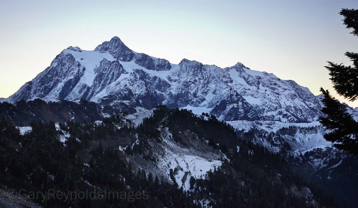 Leaving a dusted Mt. Shuksan behind me, heading out before sunrise.