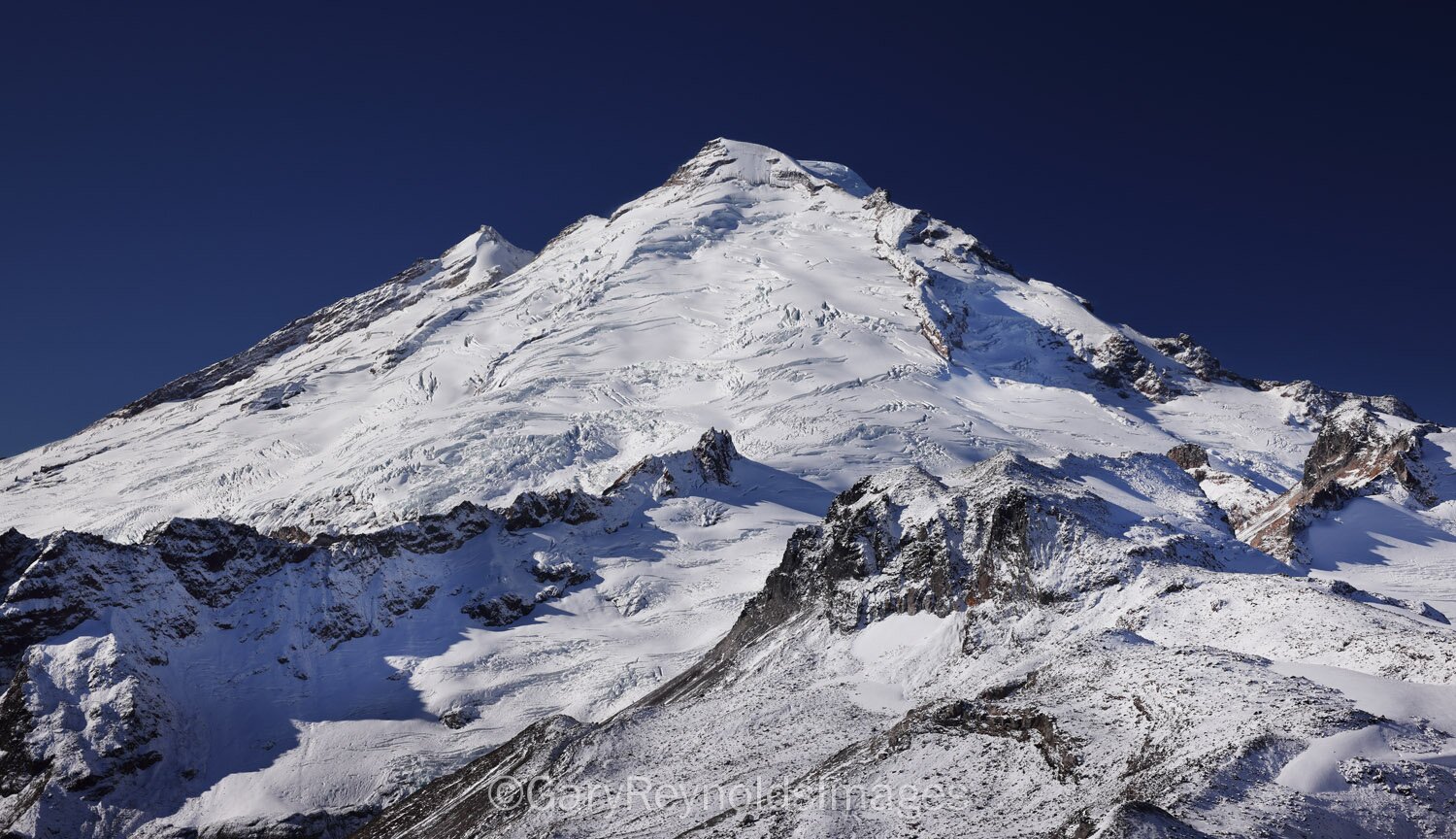 Deep blue, cold sky, with a fresh coating of snow: East face of Mt. Baker.