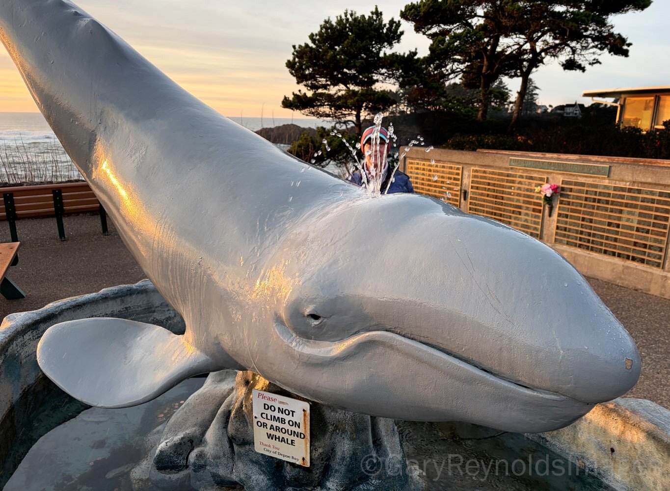 Sunset at Depoe Bay with Yvonne's favorite whale sculpture / fountain...